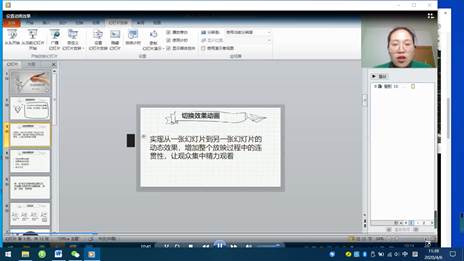 本次公开课上,李玉萍老师首先复习了上节课所学内容----幻灯片中插入多个对象的方法及属性设置的相关知识,然后通过一个锐普大赛一等奖的作品展示了ppt的强大功能,通过案例示引入课题,激发学生的学习兴趣。本节课通过三个案例教学任务,驱动本节课程知识点讲解。第一通过时钟案例学习了陀螺旋动画的设置及相关技巧,第二个案例制作飘雪的场景来学习动作路径直线动画的设置,第三个案例通过日出,升起,降落的三个动画,讲述了一个对象设置多个动画效果的方法,同时每个案例的讲解进行了知识点总结。课堂上学生互动积极性比较高,师生之间通过钉钉进行交流,有效活跃了课堂气氛,课堂教学效果非常好。
