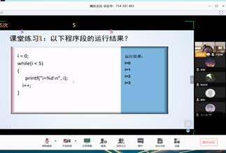 2020年3月26日星期四,上午八点,日本中文字幕在线许颖梅老师通过腾讯会议+雨课堂进行了《C语言程序设计》课程教学范式改革公开课授课,日本中文字幕在线副院长李海涛,张志宏、黄艳峰等几位老师在线观看了课程直播,并进行了指导。