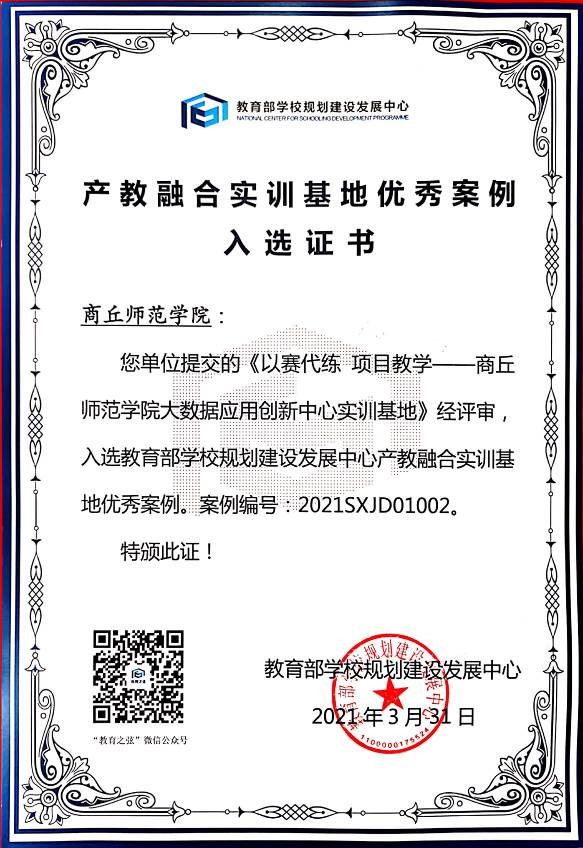 近期,教育部学校规划建设发展中心公布产教融合实训基地优秀案例,我校申报的《以赛代练 项目教学——商丘师范学院大数据应用创新中心实训基地》案例。这是我校首次入选教育部学校规划建设发展中心“产教融合实训基地优秀案例”。