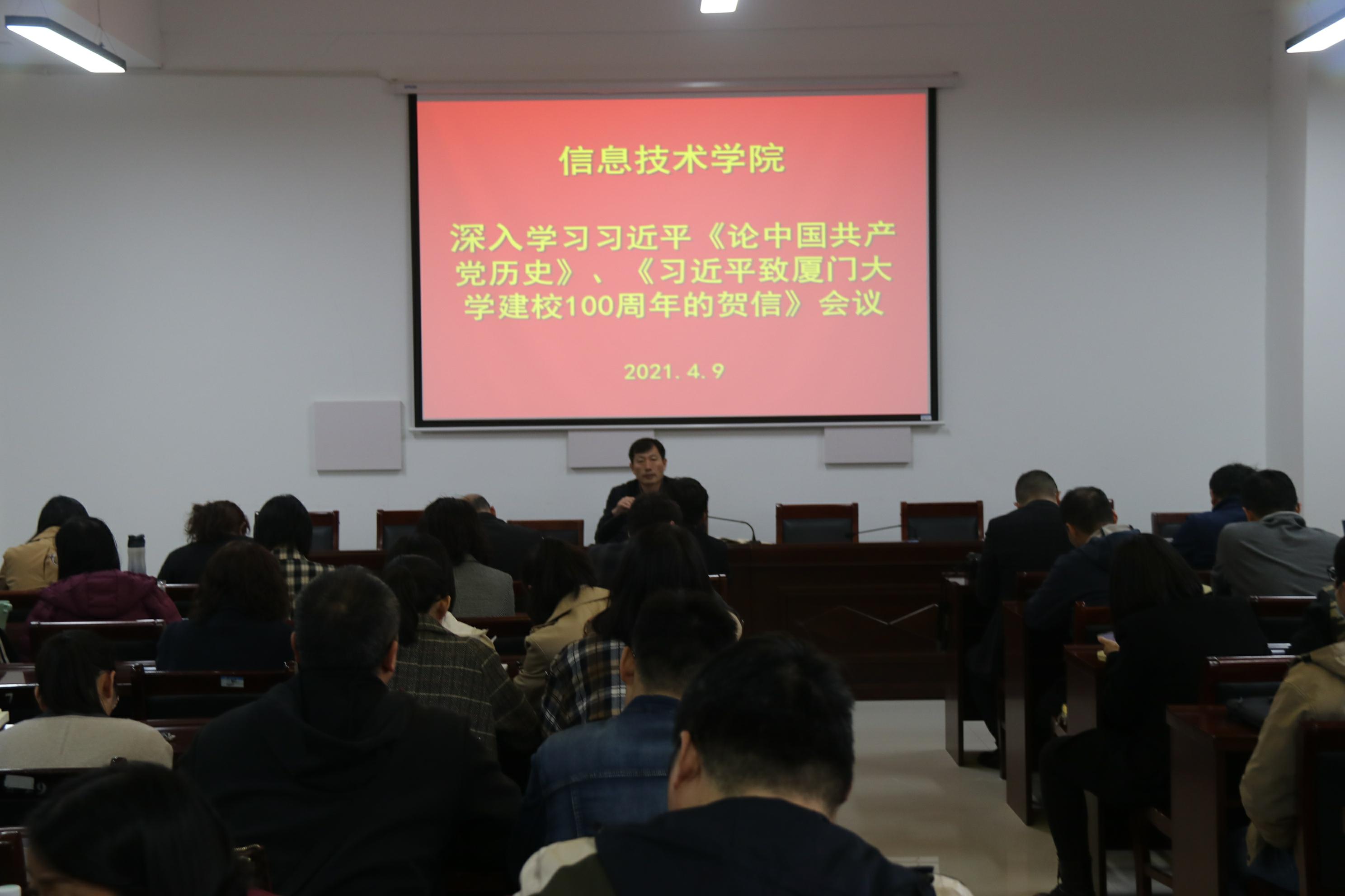 会议上,李院长就《习近平致厦门大学建校一百周年的贺信》中全面贯彻党的教育方针和切实落实立德树人的根本任务做出讲话,他要求全体教职工要做好自己的本职工作,为国家培养优秀人才。随后带领大家共同学习《论中国共产党历史》的前四篇重要文稿,他提到实现中华民族伟大复兴是中华民族近代以来最伟大的梦想,希望大家要更加紧密的团结起来,做到知史爱党、知史爱国,并正确认识改革开放前与开放后的两个重要历史时期。最后,他强调学习党史、国史是坚持发展特色社会主义所必不可少的内容,希望全体教职工能够更加深入了解这段历史,更加爱党爱国。