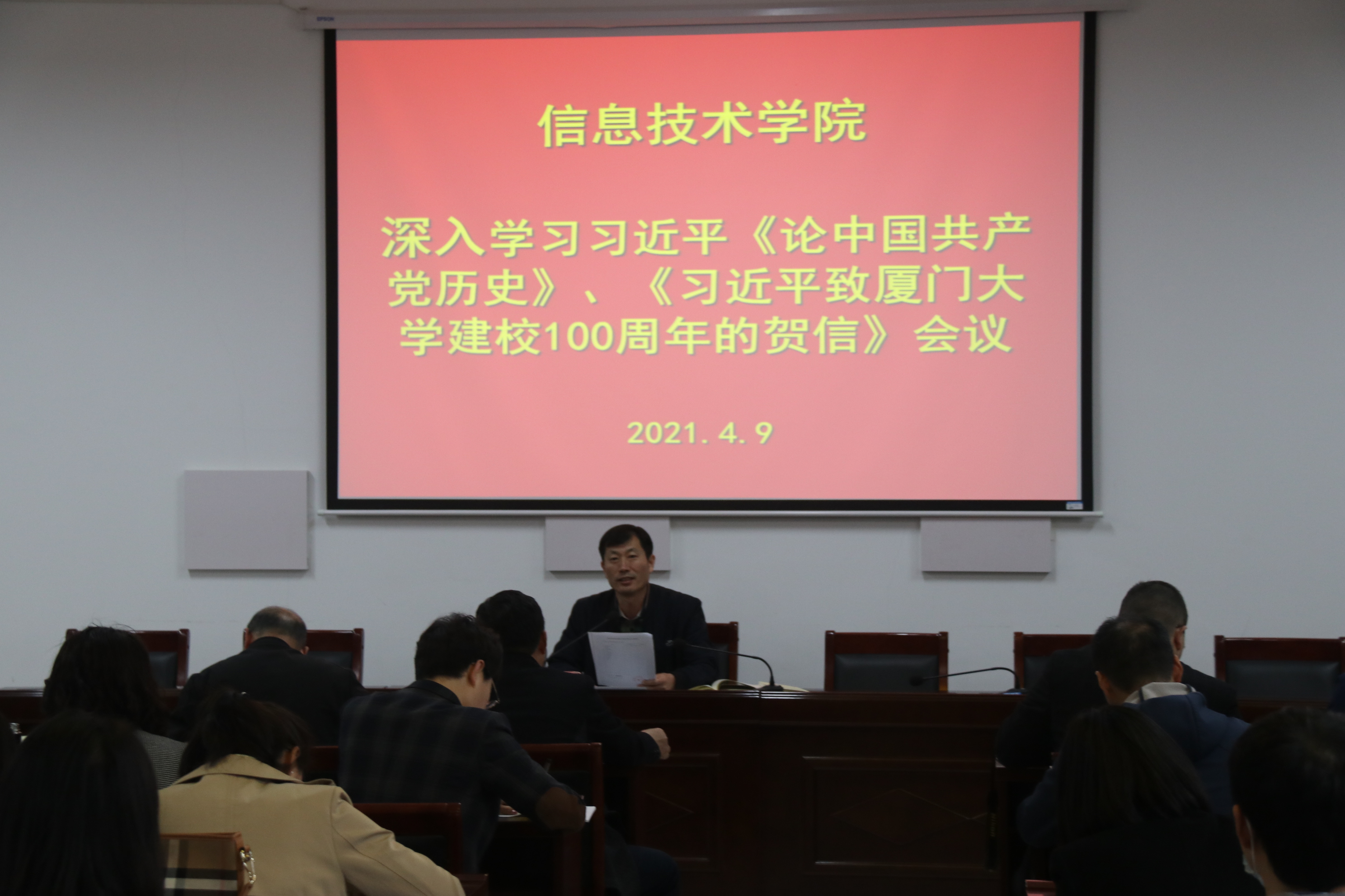 4月9日,日本中文字幕在线于梁园校区三商楼112会议室举办深入学习习近平《论中国共产党历史》、《习近平致厦门大学建校一百周年的贺信》会议。会议由副院长李海涛主持,全体教职工参加了本次会议。