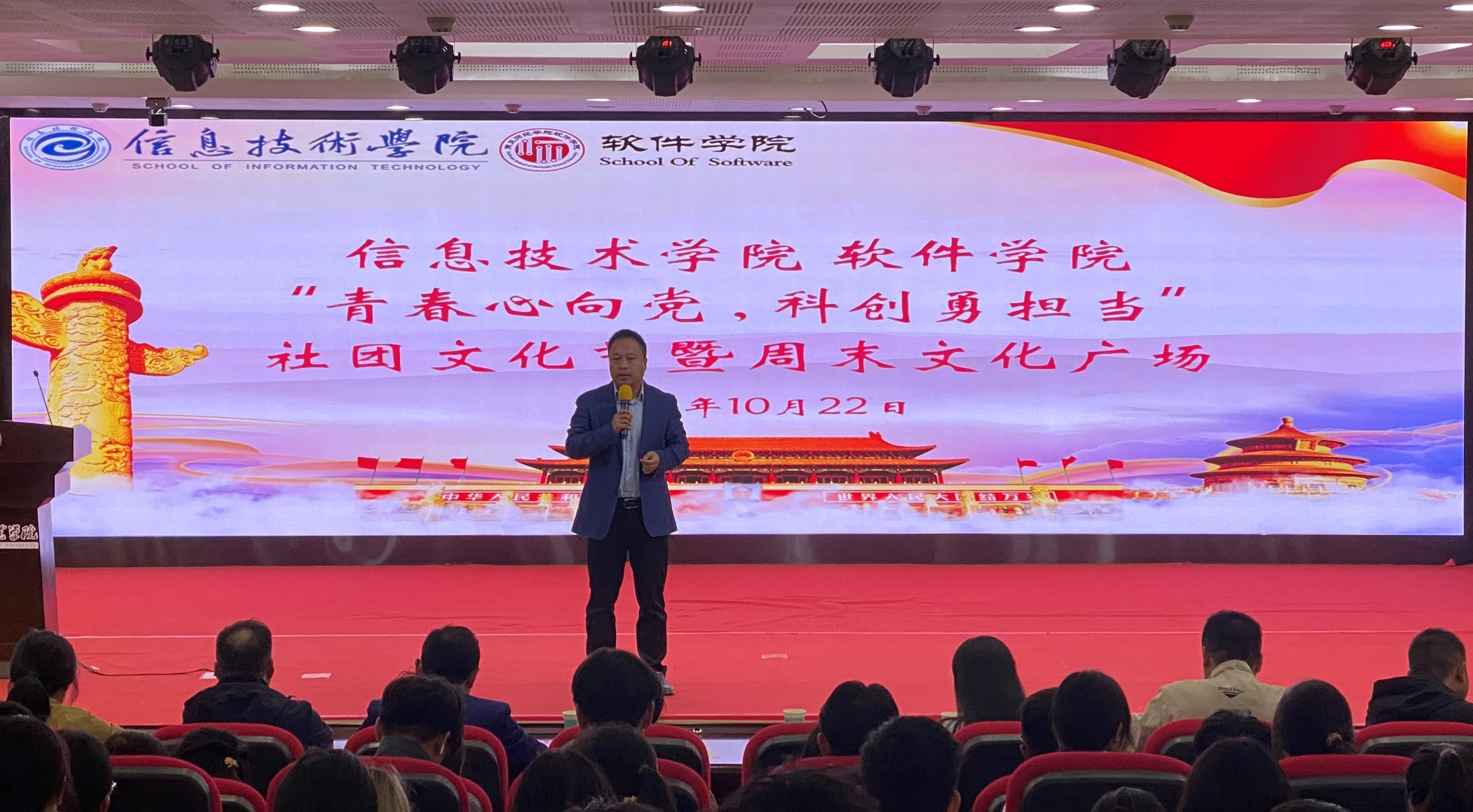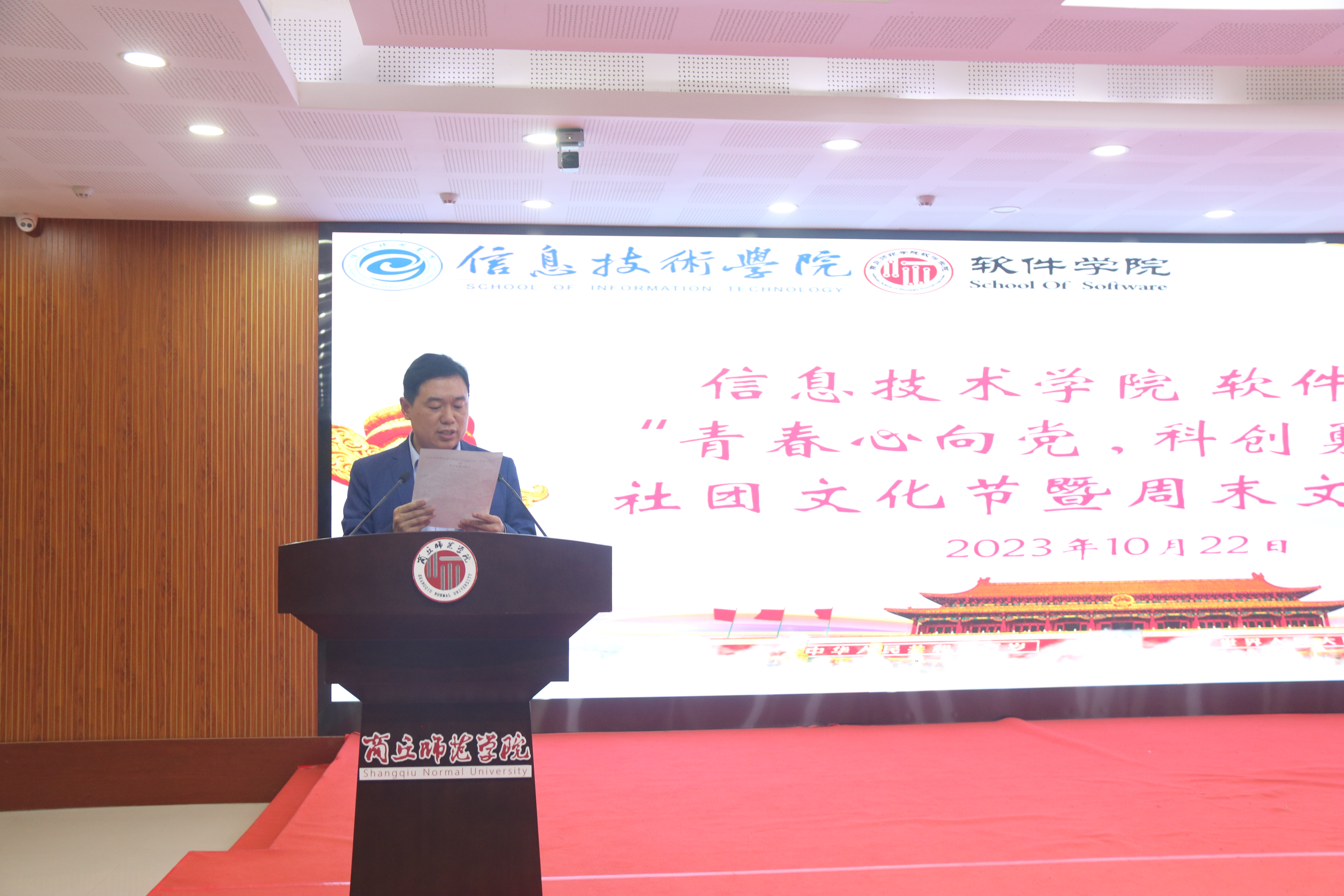 为进一步涵育优良学风,营造积极向上的学习氛围。10月22日晚,日本中文字幕在线在梁园校区三商楼举办了以“青春心向党,科创勇担当”为主题的社团文化节暨周末文化广场活动。信息技术学院党委书记王国华、院长王春霞、副书记袁慧、副院长刘佳、各社团指导老师和两百余名学生代表参加了活动。本次社团文化节共分为两个环节,分别在145主会场和八个分会场进行。