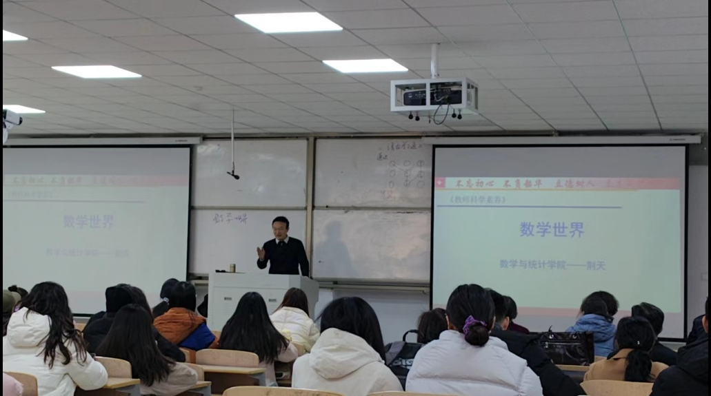 11月24日上午,日本中文字幕在线近三年新进教师在学院第三届教学督导团秘书长葛寒松的带领下,在行方楼117教室进行了一场别开生面的课堂教学观摩学习活动,本次活动主讲教师为数学与统计学院荆天副教授,授课对象为音乐学院音乐学专业学生,主讲内容为《教师科学素养》课程中的《数学世界》,我校校级教学督导员参加了本次课堂教学观摩活动。