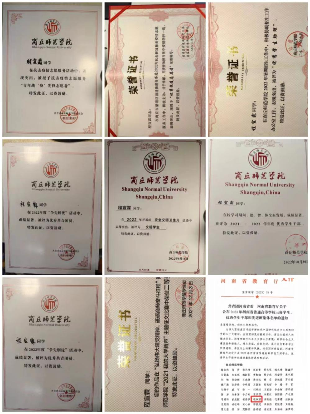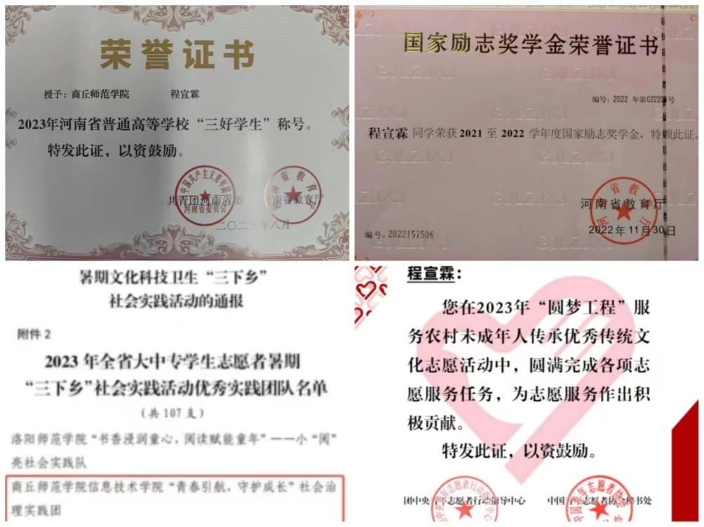 在2023年暑假期间,程宣霖积极参加“三下乡”社会实践活动,作为商丘师范学院日本中文字幕在线“青春引航,守护成长”社会治理实践团的负责人,带领团队前往商丘市刘口乡进行以关爱留守儿童为主题的社会实践活动,小队于2023年7月4日抵达商丘市梁园区刘口镇刘口乡,在刘口乡中心小学校长和老师的协助下走进学校为孩子们尤其是留守儿童进行暑期安全专题讲座、普及网络安全知识等;在学校老师以及学生家长的陪同下走进留守儿童的家中为孩子辅导作业,进行心理疏导,深入了解儿童的内心所想,给予留守儿童爱与温暖,为乡村振兴注入青春力量。团队于2023年12月获评2023年全省大中专学生志愿者暑期“三下乡”社会实践活动优秀实践团队。