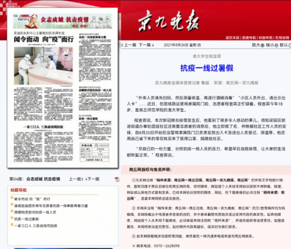 2021年高考后的暑假,程宣霖作为一名准大学生时就参与疫情防控志愿服务工作,当得知梁园区前进街道办事处团结社区还需要志愿者的消息后立即报了名,并根据社区工作人员的安排,多次参加社区疫情防控。后来还用自己省下来的零花钱买来了医用口罩,捐赠于社区。事迹于2021年8月被京九晚报采访报道,用实际行动协助疫情防控工作进行,为国家和社会贡献自己的力量。