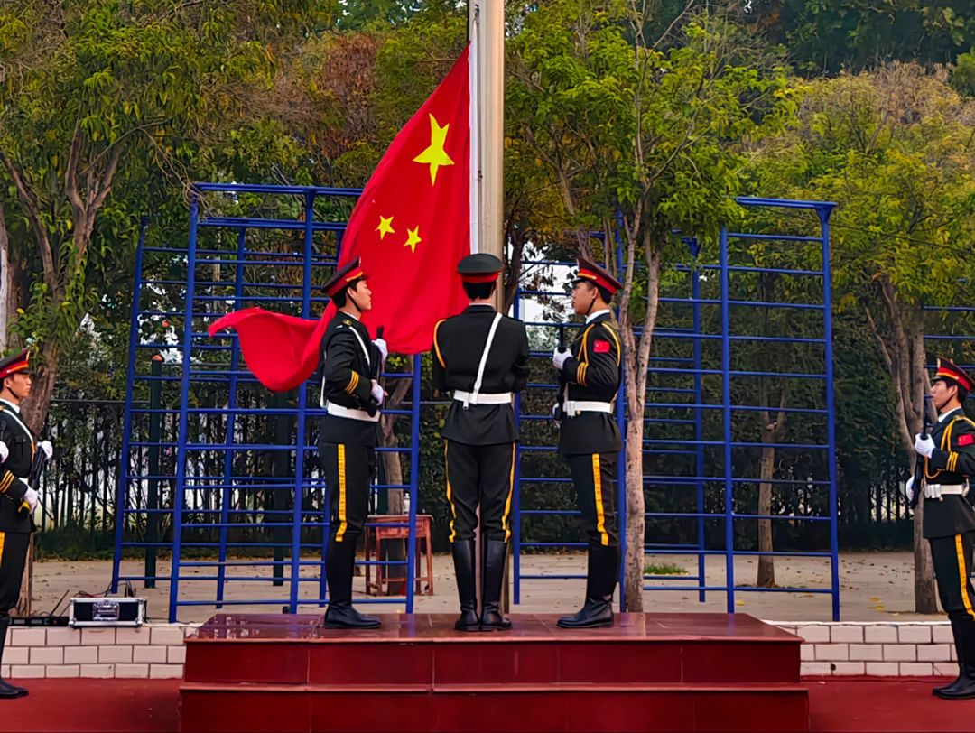 国旗护卫队迈着整齐的步伐,护送鲜艳的五星红旗至升旗台。在嘹亮的国歌声中,国旗冉冉升起,全体师生面向红旗行注目礼,共唱国歌。