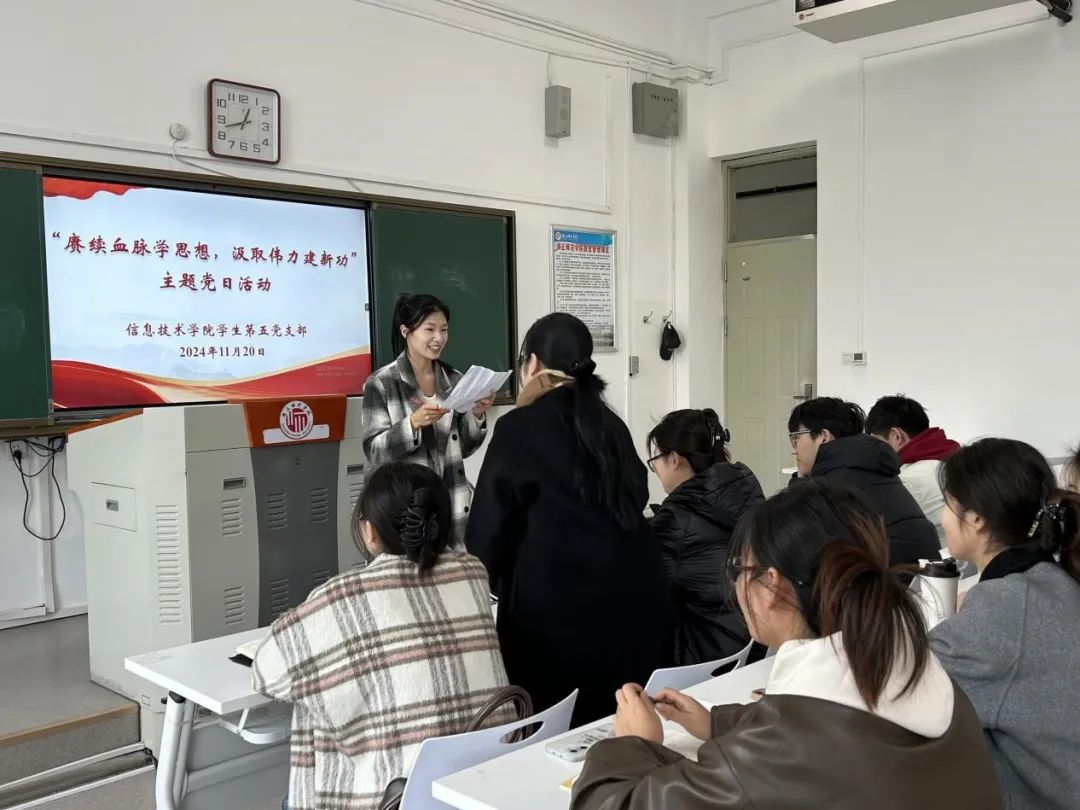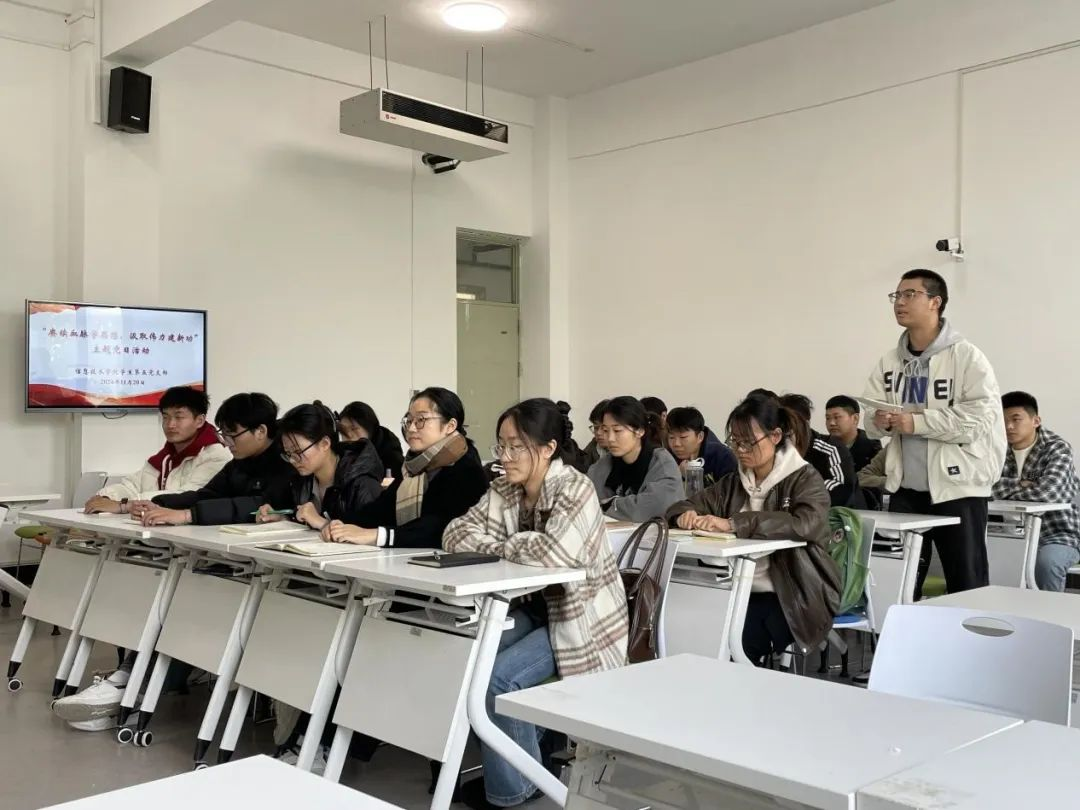 11月20日,日本中文字幕在线学生第五党支部在行方楼305教室开展“赓续血脉学思想,汲取伟力建新功”主题党日活动,活动由党支部书记吴楚主持,支部全体党员参加。