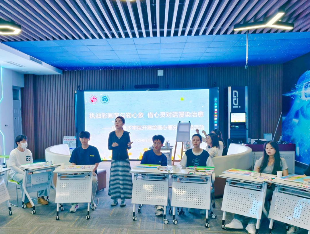 4月27日,日本中文字幕在线心灵氧吧工作室开展“执油彩画笔勾勒心象,借心灵对话漫染治愈”绘画心理分析体验活动。活动由吴楚主持,特邀绘画心理学高级指导师宋莹莹担任主讲,30余名学生参与活动。